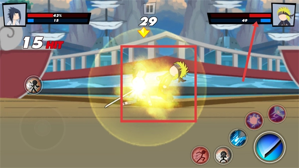 3、释放技能时会触发【15HIT】的连击特效,该特效将持续对敌方造成血量消耗,从而压制对手的血线。