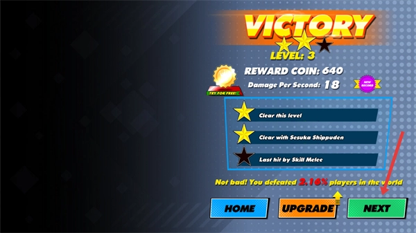 4、战胜敌人后会弹出【VICTORY】结算界面,点击【NEXT】按钮即可进入下一关。