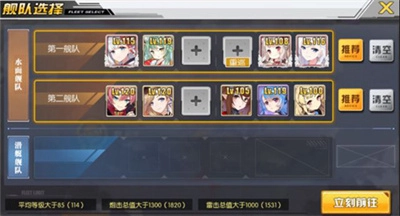 2、队伍配置建议:第一队负责道中作战,第二队专攻BOSS战;第一队在全图扫荡时,需留意旗舰的血量情况,若血量过低,可将补给舰调整至旗舰位置;队伍等级达到100级即可满足需求。