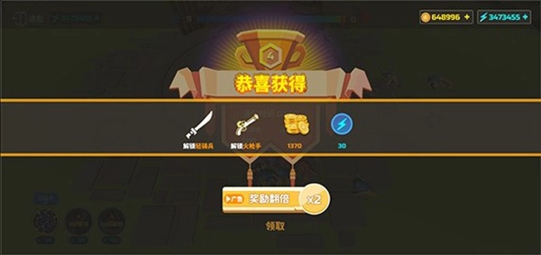 消灭敌方全部士兵就能赢得胜利,获胜后会得到奖励。玩家可以选择点击观看广告来获取双倍奖励,也可以直接领取奖励而无需观看广告。