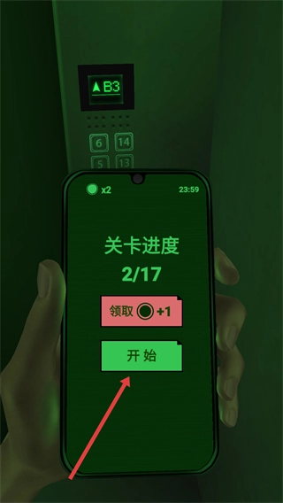 1、在手机界面找到并查看【关卡进度-2/17】,点击【开始】按钮,即可进入该关卡对应的电梯挑战环节。