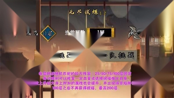 2、挑战规则说明如下:每层挑战的敌方阵容均为随机匹配(但25、50、75、100层为固定阵容);每次挑战胜利后,玩家可选择恢复一定血量,或选取祝福来强化自身能力;随着挑战层数的提升,敌方角色附加的属性会相应增强,同时还会出现场景陷阱等特殊效果;当挑战层数超过100层后,玩家将不再获得祝福,该挑战的最高层数为200层。