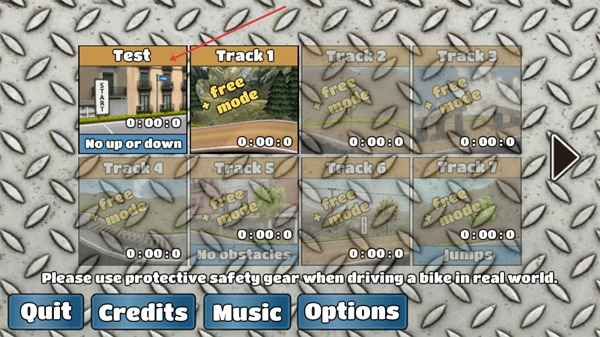 1、在赛道选择界面,点击Test赛道可进入该赛道,也能选择其他目标赛道,确认后就能开启摩托车竞速关卡。