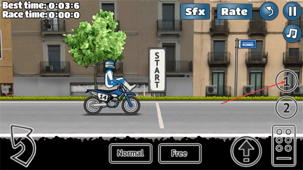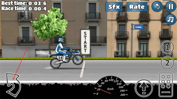 4、在竞速过程中能够切换模式,借助右侧的数字按钮来调整角色的坐姿状态,以此保持摩托车的平稳行驶,从而顺利通过赛道中的各个路段,完成竞速关卡。