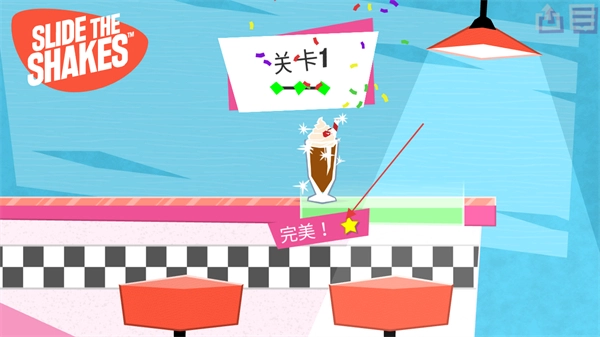 3、当奶昔成功滑入绿色区域后,界面会弹出完美的通关提示,这意味着关卡1已顺利完成,接下来就可以准备进入下一关了。