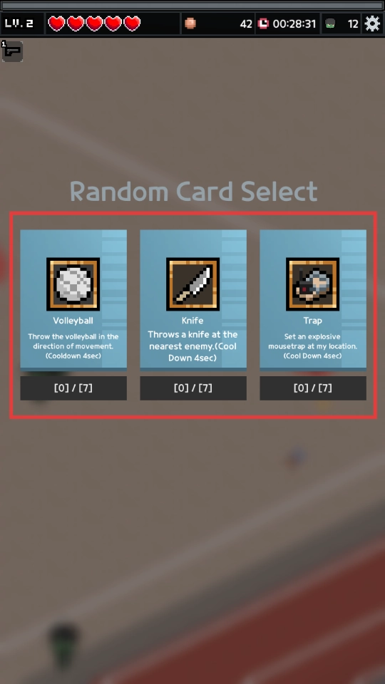 4、关卡升级后会出现【随机卡牌选择】机制,玩家需从【排球】【小刀】【陷阱】这三类卡牌中进行挑选,以此丰富战斗方式,更好地应对实力更强的僵尸。