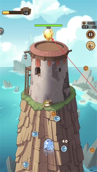 2、英雄会在塔顶自动进行战斗,通过击败敌人来获取金币、经验等各类资源,以此积累进度。