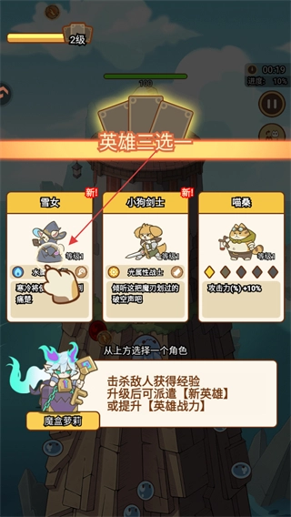 1、在英雄三选一的界面选择喵桑,将这个英雄派遣至战斗中,推进14级的关卡。