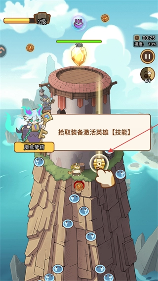 4、通过拾取装备来激活英雄技能,以此提升战斗能力,从而持续推进关卡进度。