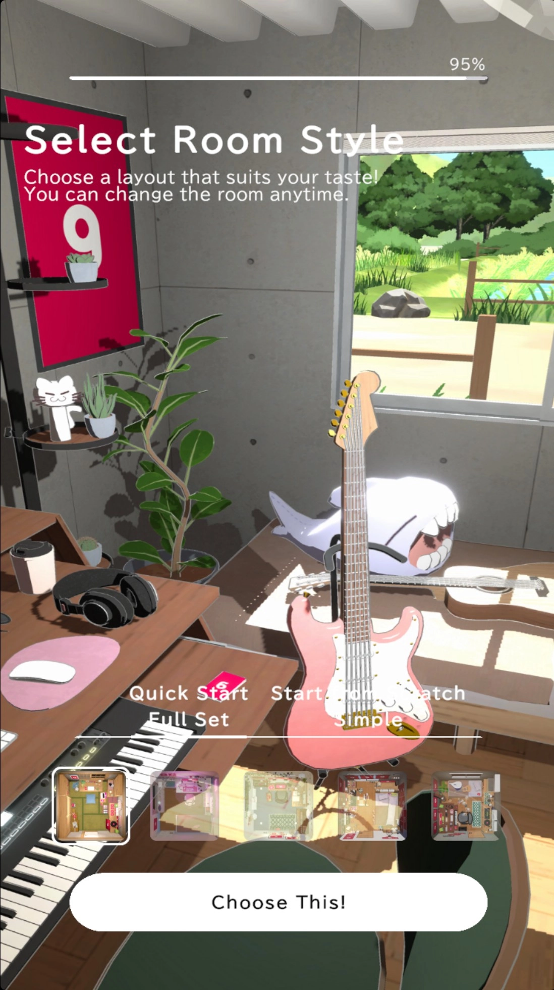 3、接下来,从五种风格各异的房间里选一个心仪的场景,正式进入游戏后,你会看到角色正安静地坐在桌前。