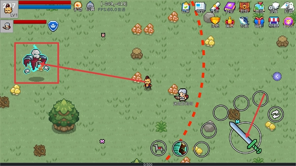 3、进入游戏后角色等级为【LV1】,界面底部的攻击按钮能触发战斗,需要点击此按钮与场景里的怪物对战,以此推进初期的冒险进程。