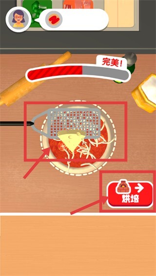 3、加入芝士类食材后,点击标注好的【烘焙】按钮即可完成这一环节,进度条会显示【完美】,从而推动披萨的制作流程继续进行。