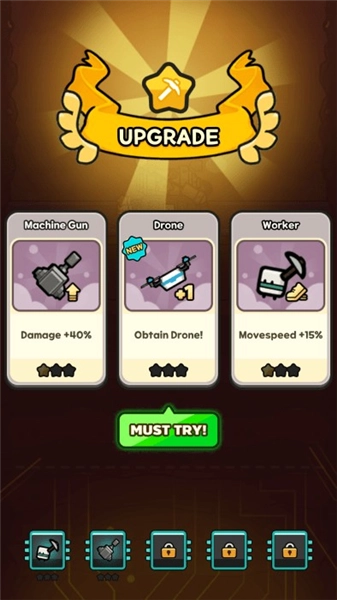 3. 神装无限强化:解锁并升级无人机、导弹、机枪等炫酷装备!全方位提高你的挖掘效率与战斗能力!