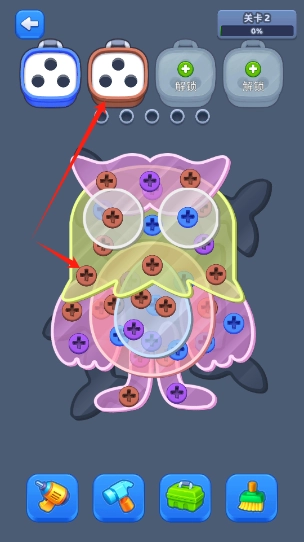 1、核心玩法聚焦于螺丝的收集与消除,玩家需点击操作让不同颜色的螺丝回到对应位置。当同色螺丝将专属盒子填满时,便会触发消除机制,简洁的规则背后藏着巧妙的策略设计。