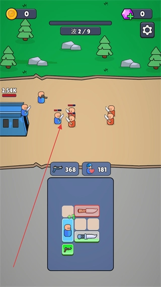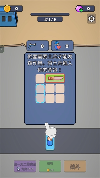 1、在波2/9界面点击召唤按钮,获取新的武器或部队,以此补充背包的配置。
