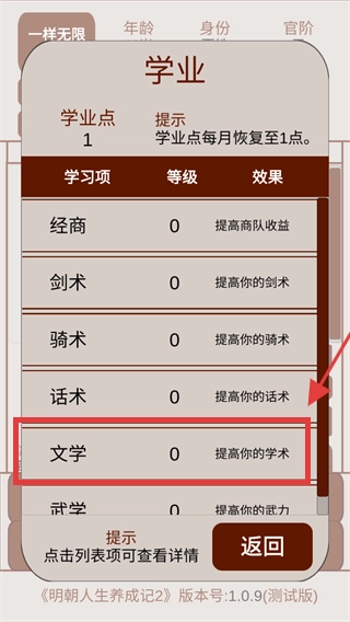 1、优先提升【文学】属性来积累学业点,学业点每月会恢复1点,这样能为后续入朝为官的职业道路筑牢根基,提前达成官职要求的属性条件。