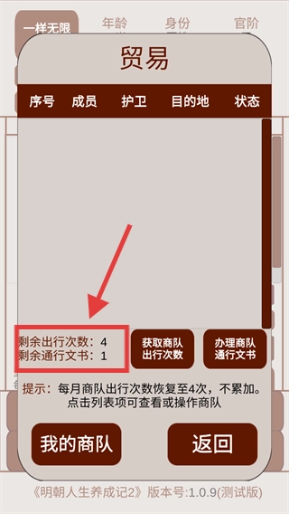 2、借助剩下的【4】次商队出行机会进行贸易,能够经营商队或是获得更多出行次数,积累财富与资源,为后续的职业发展以及势力拓展提供支持。