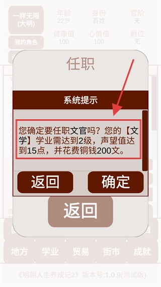 3、担任文官需满足【文学】等级达到2级、声望积累至15点以及拥有200文铜钱的条件,待满足这些要求后确认任职,即可开启官场派系斗争与官职晋升的相关路径。