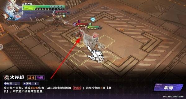 2、确定目标后挑选技能,例如火神枪战技,对单个目标发起攻击并造成伤害,当满足特定条件时,该技能无需消耗能量,并且可以为目标施加灼烧状态。