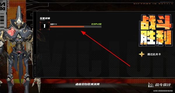4、在场上击败敌人后,会弹出战斗胜利界面,此时可以获得玩家经验。你可以点击空白区域关闭该界面,也能够查看战斗统计情况,之后就能继续挑战新的关卡了。