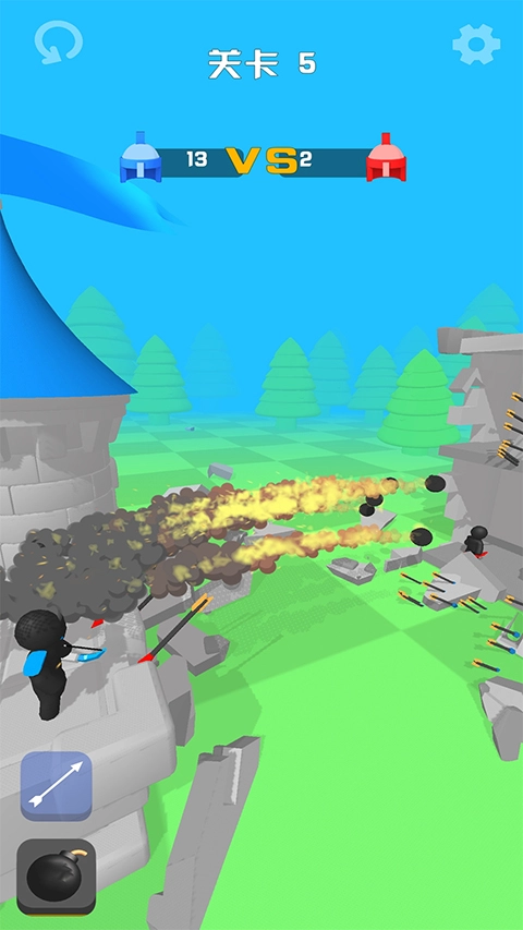 3. 简约美术风格:游戏运用火柴人结合鲜明色块的简约美术风格,凸显了射击对抗的核心趣味,让玩家可以更专注于射箭这一核心操作。