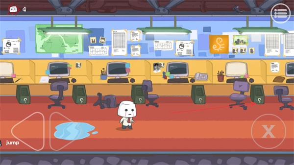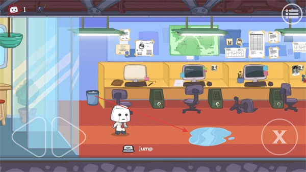 3、在办公室场景中点击jump进行跳跃,避开地面的水渍等障碍,以继续探索该区域。