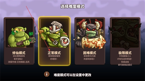 1、在难度模式选择界面,若选中正常模式,可体验轻松愉快的塔防玩法,后续也能在设置里对该难度模式进行调整。