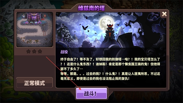 在维兹南的塔的战役界面,查看剧情后点击战斗按钮,就能进入对应的关卡,开启塔防战斗流程。
