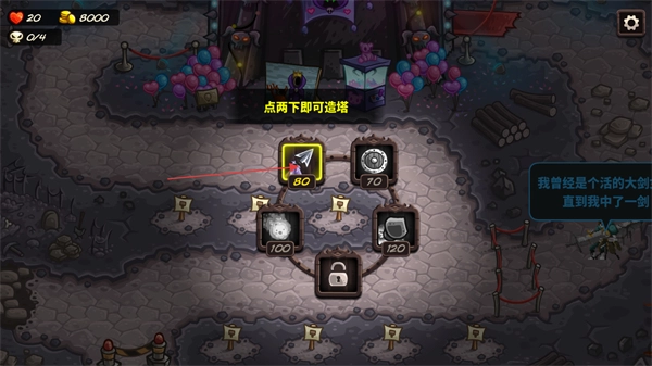 4、按照提示点击两次就能建造防御塔,在造塔界面选择对应的塔型后,再点击两次即可完成该防御塔的建造,用于抵御敌人。