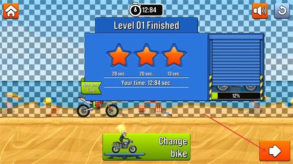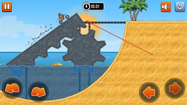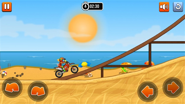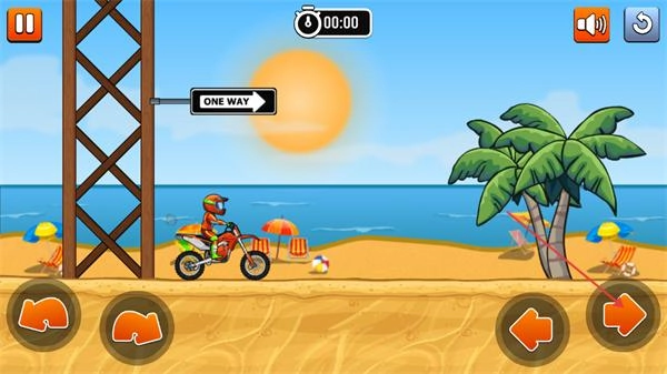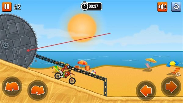 3、通过障碍路段后,继续操控摩托在沙滩赛道行进,借助方向与平衡按钮调整摩托状态,加速驶离该障碍的攻击范围,朝着关卡终点推进。