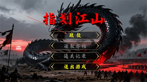 1、进入指划江山游戏的主界面,这里有战役、读取存档等功能选项,选择战役选项就能进入对应的策略战役关卡,开启势力争霸的游戏进程。