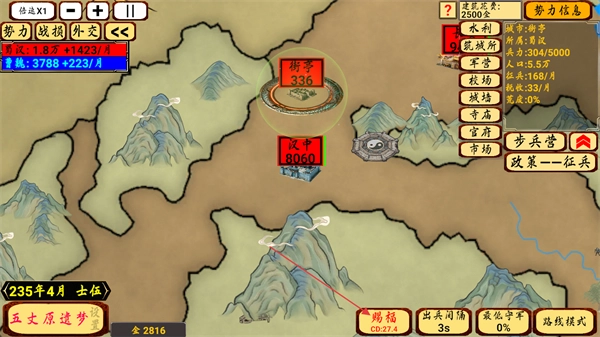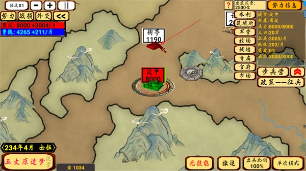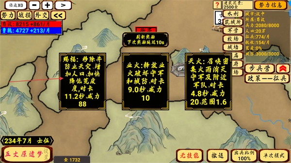 4、在战役后续的地图界面中,会呈现街亭与汉中的兵力数值变动情况,点击赐福技能并将其应用于城镇,以此稳固己方势力的发展态势。