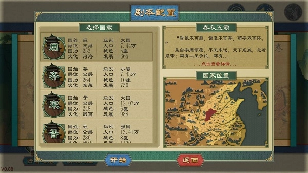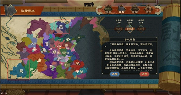 在“春秋—春秋五霸”这一剧本里,建议挑选“蜀国”和“燕国”,先在边角地带稳步发展,尽量减少卷入战事,等国力积攒到合适程度后再逐步向外拓展势力。