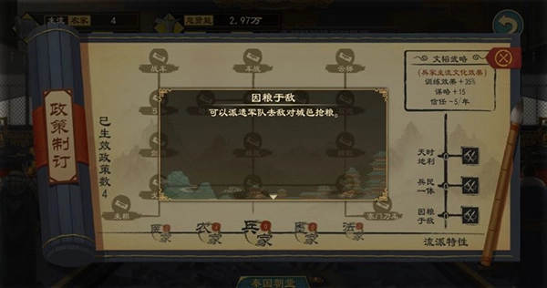 统一四海的进程中必然伴随着无数的征战,战争里士兵的战斗力与将领的谋略能力起着关键作用。在兵家流派的加持下,士兵的训练成效能获得35%的增益,作战时还可额外增加15点谋略值,受这两大核心因素的影响,军队的战斗能力得到显著增强,即便在预备役兵员短缺的情况下,也能有效留存兵力、节约资源。