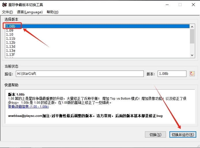 6、选择1.08b版本后,点击切换并运行。