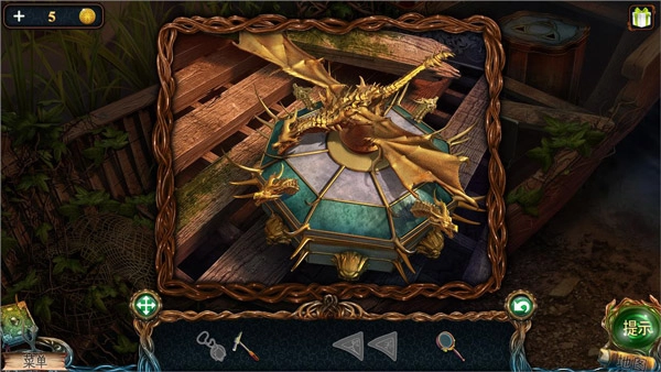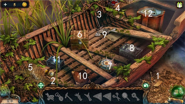 10、点击图中的3号小船,在1号位置获取龙塑像,2号位置获取钥匙,4号位置完成拼图后得到剪刀,用剪刀对5号位置操作可获得天使雕塑。