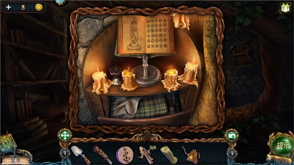 5、在小屋内部,于图中标注1的柜子位置可获取一支未点燃的蜡烛。点击蜡烛旁的书籍进行阅读,能得到关于美人鱼与生命之湖的线索;之后再次点击这本书,会提示“这里”藏有密码。接着打开柜子的抽屉,点击里面的布料即可获得油壶。