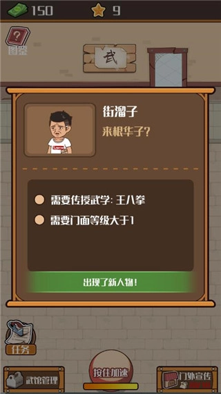 协助玩家打理武馆,自动收缴铜钱、驱逐窃贼、鞭策弟子练功等;