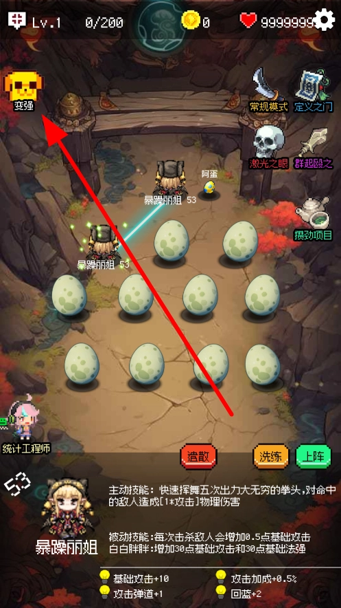 点击“变强”选项后进入对应的界面,就能对角色的各项属性、技能等进行强化升级,以此为后续的战斗和角色成长筑牢根基,进一步提升角色的战斗能力。