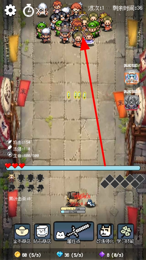进入战斗场景后,操控角色向敌人发起攻击,借助提升后的属性更高效地打击敌人,在一波波进攻中消灭更多敌人,以此推进战斗进程。