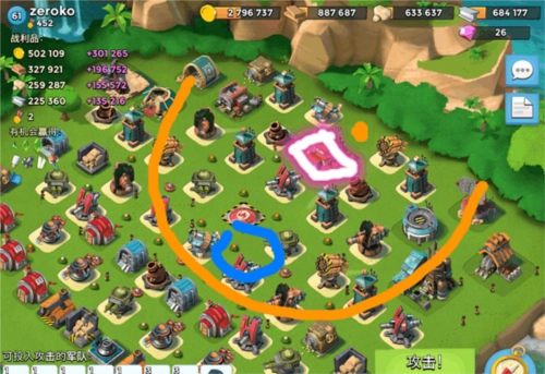 这里要说到一个关键的卡位技巧——当你部队里还有其他单位,但不想让它们攻击控制类建筑时,该怎么操作呢?拿纯妹流来举例:你可以先把妹妹们引导到菊花(菊花炮)的后方位置,接着再引导向大本;这时候按下技能,只要伊娃的距离足够近,就能成功控制住菊花炮,这样既能吸引敌方火力,又能解决这个棘手的目标。要是目标在不同方位,可能还得配合使用震爆弹。不过这个技巧挺考验实战经验和操作意识的,我自己也还没完全掌握好。