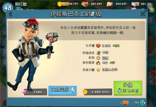 这是一个最初级的英雄,很适合前期玩家用来当输出兼肉盾。它的三维属性没什么特别突出的地方,技能在初期还算不错,就像是前期的一发火炮,伤害也不能算低。