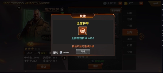 提升战力有两个便捷途径:一是持续获取英雄,通过提升军力等级来增强战力;二是升级战车,特别是升级那些能增加全体属性的战车技能,其中全体护甲属性对提升战力的效果最为显著。