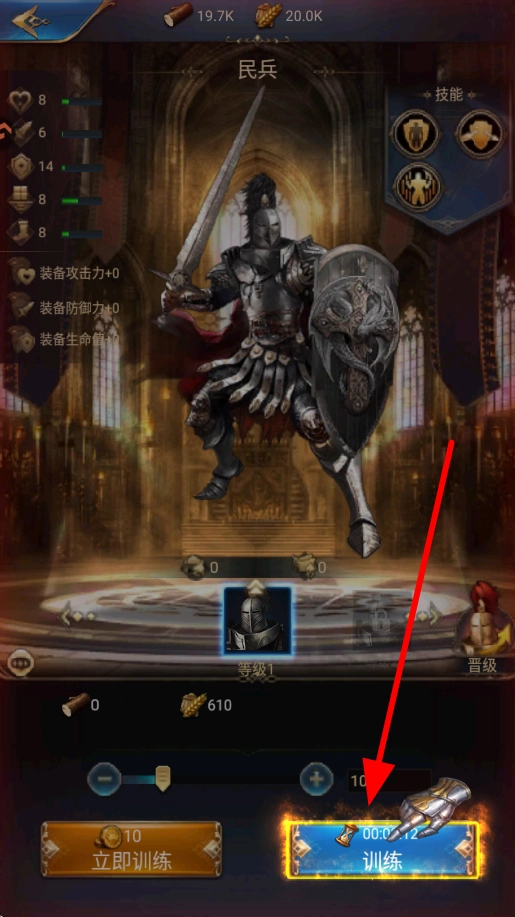 接着进入士兵训练界面,挑选民兵之类的士兵类型,备齐所需资源后,点击训练按钮,培育部队力量,以此增强领地的军事能力。