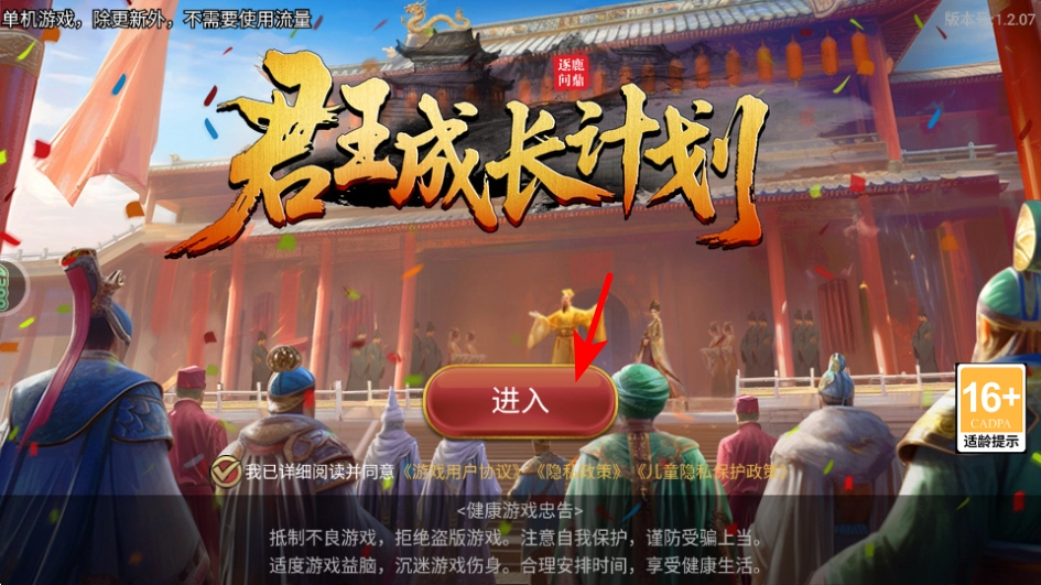 1、在游戏启动界面,勾选协议后点击进入按钮即可开启君王成长玩法,这是朝政管理的基础操作,后续可通过早朝、推进国家建设等方式体验核心内容。
