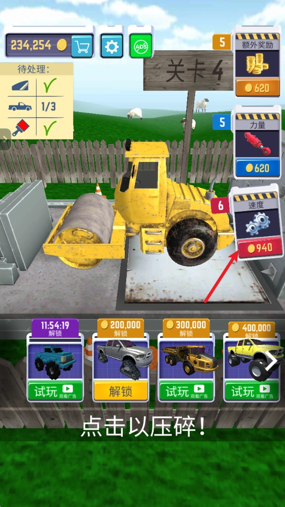 2、通过收集金币提升力量、速度等各项属性,助力你更高效地通关,尽情体验粉碎更多汽车的畅快乐趣。