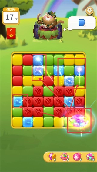 3、触发被红色框选的【特效方块】,借助它的范围消除功能,能快速提升蓝色方块的收集进度,目前还剩【17步】,完全足够达成目标。
