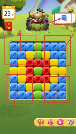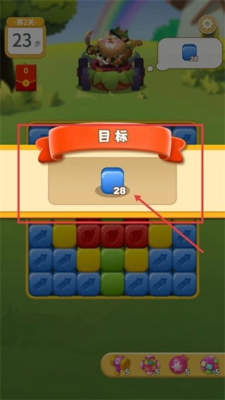 1、进入界面后,首先确认红色框内标注的【目标】:收集【蓝色方块-28个】,当前剩余步数为【23步】,需要提前规划消除的节奏,优先处理与蓝色方块相关的区域。