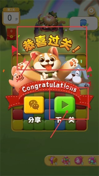 4、成功达成【恭喜过关】后,你可以点击被红色框选标注的【下一关】按钮,继续去挑战后面的关卡;当然,你也能够选择点击【分享】按钮,以此来展示你本次成功通关的成果。
