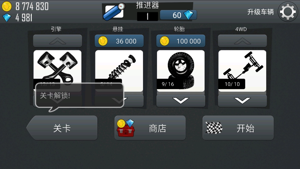 进入游戏后点击开始游戏,进入升级自己的赛车